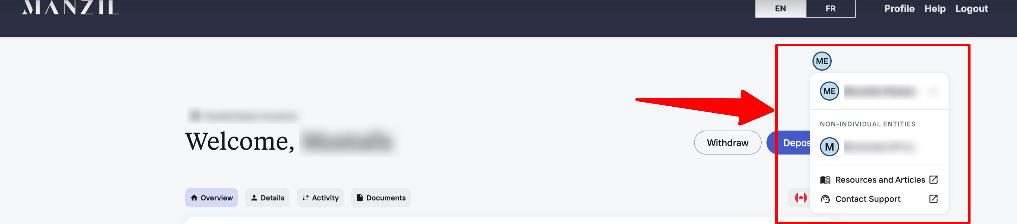 - Dans le menu déroulant, cliquez sur le nom de votre compte de société/entité non individuelle.