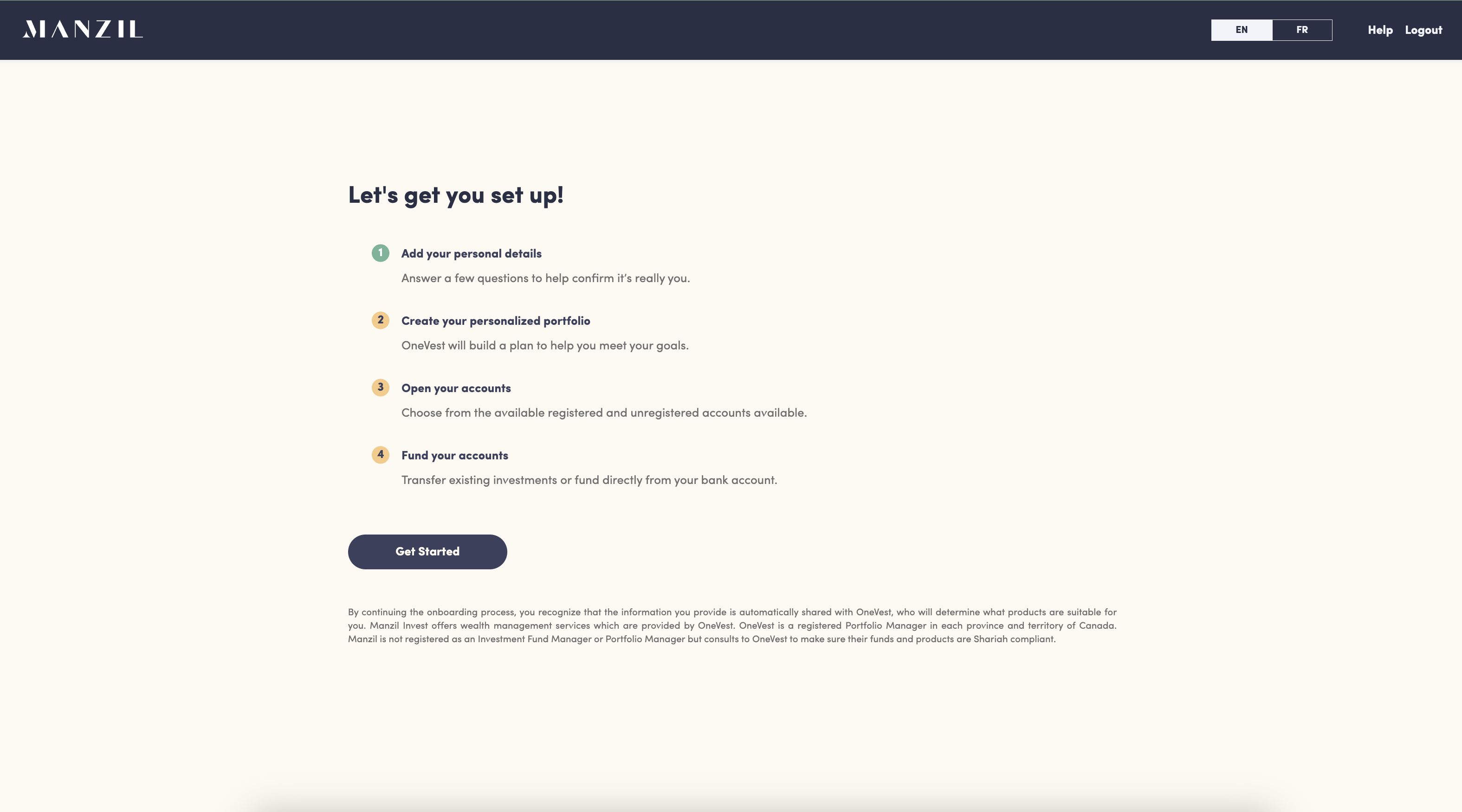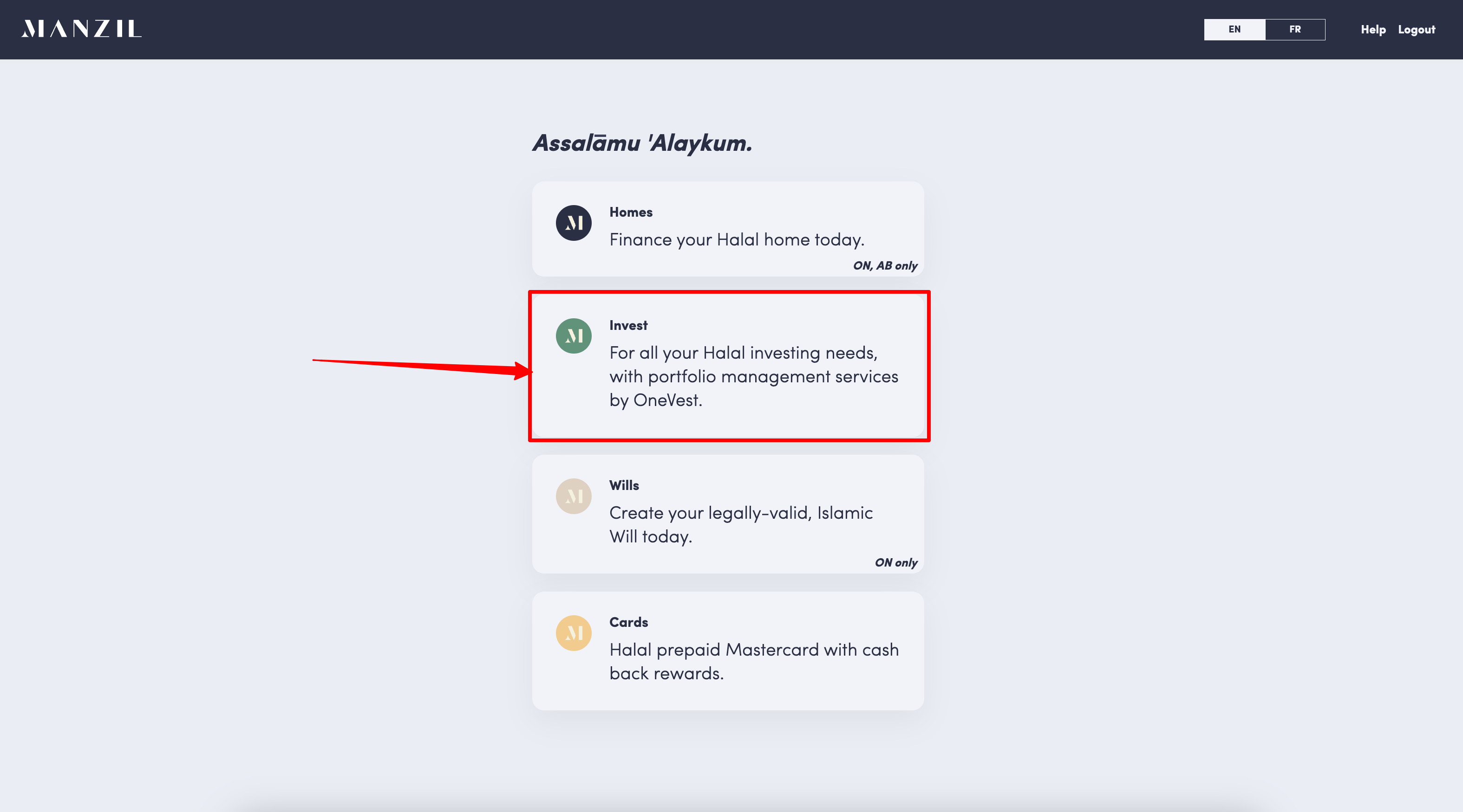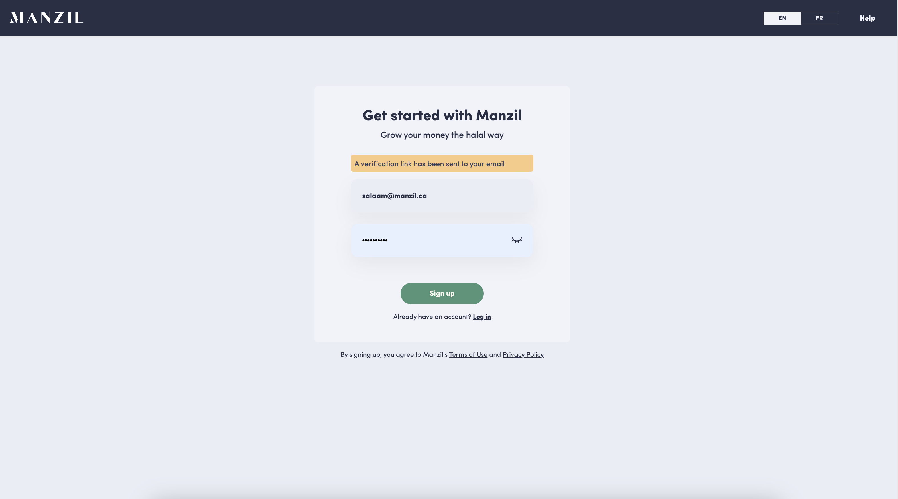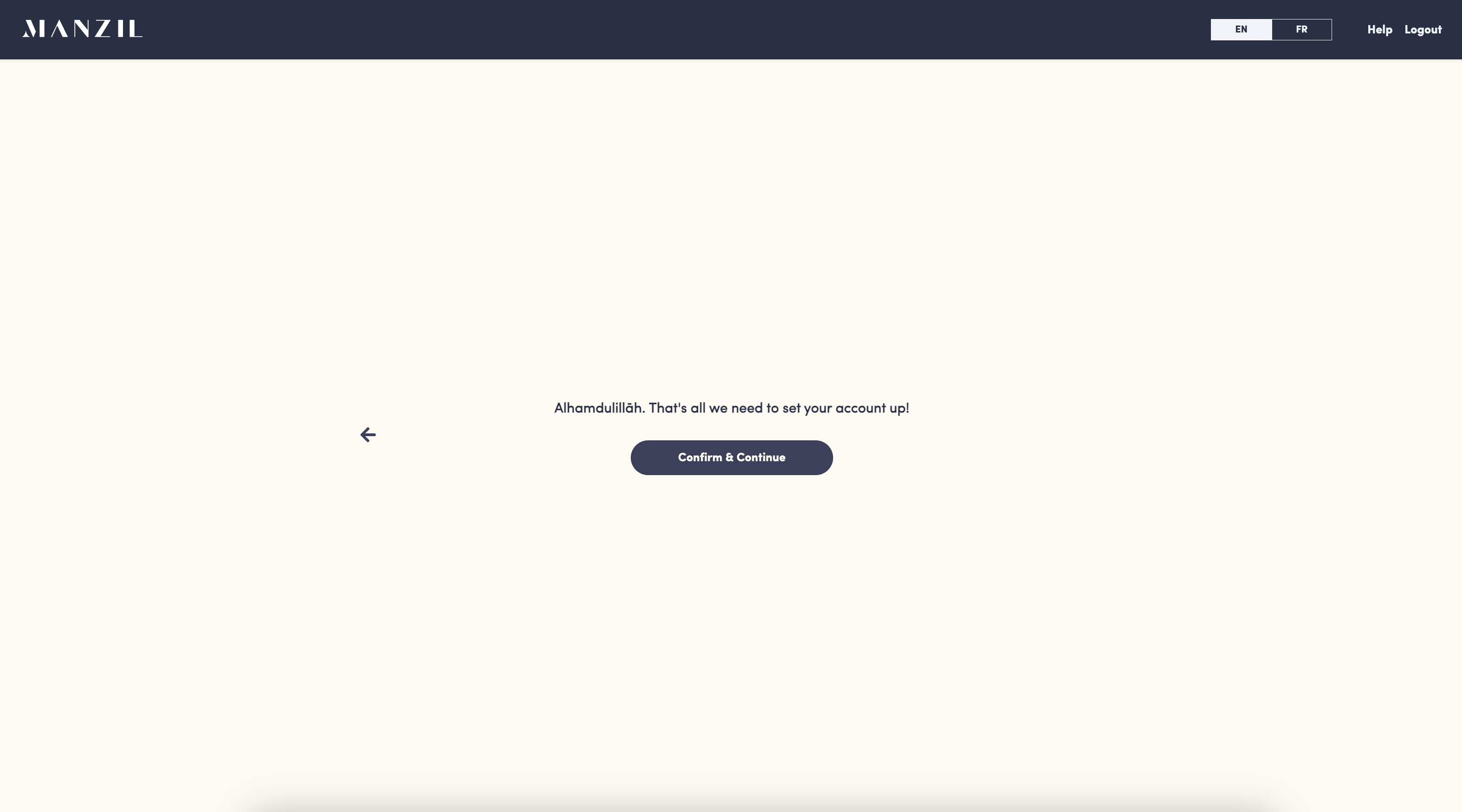 Votre compte Manzil Invest a été créé. Vous pouvez maintenant continuer à créer les différents types de comptes de placement (c.-à-d. REER, CELI, non enregistré, etc.) qui sont disponibles Inshā Allah.