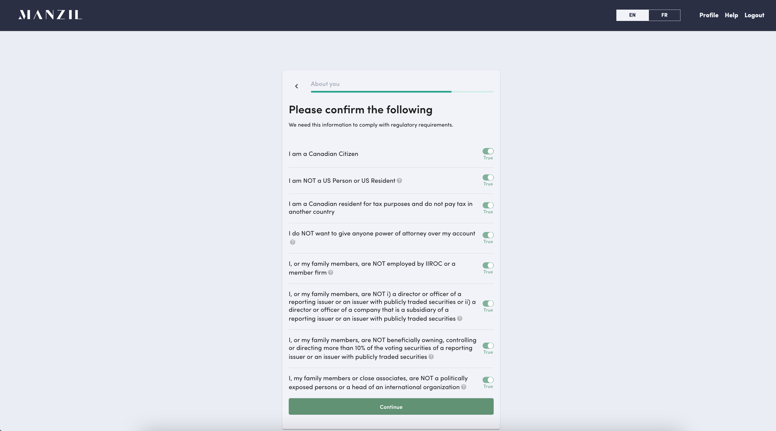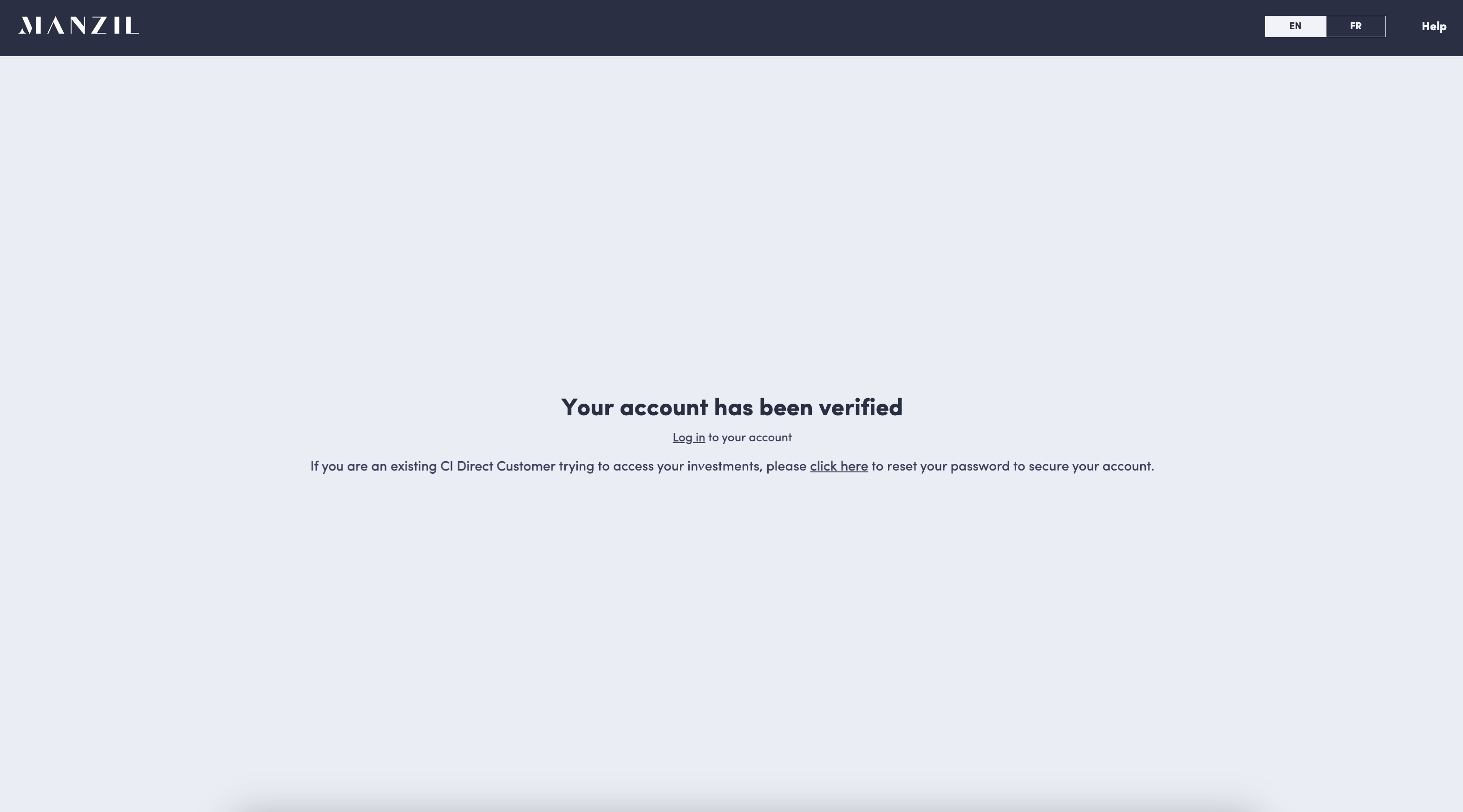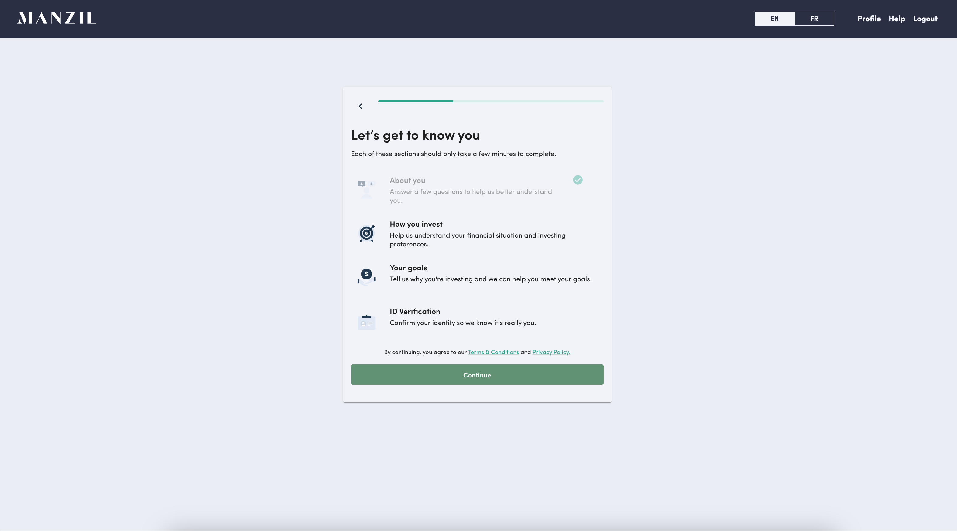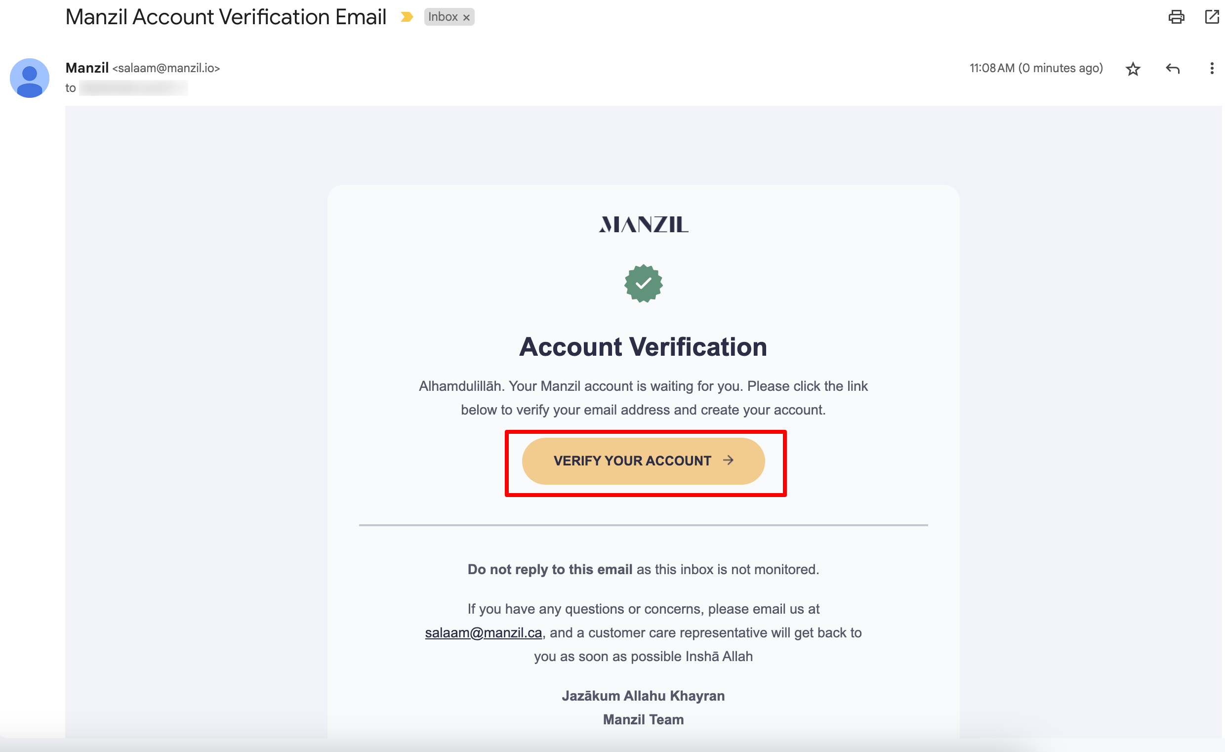 Votre compte Manzil Invest a été créé. Vous pouvez maintenant continuer à créer les différents types de comptes de placement (c.-à-d. REER, CELI, non enregistré, etc.) qui sont disponibles Inshā Allah.